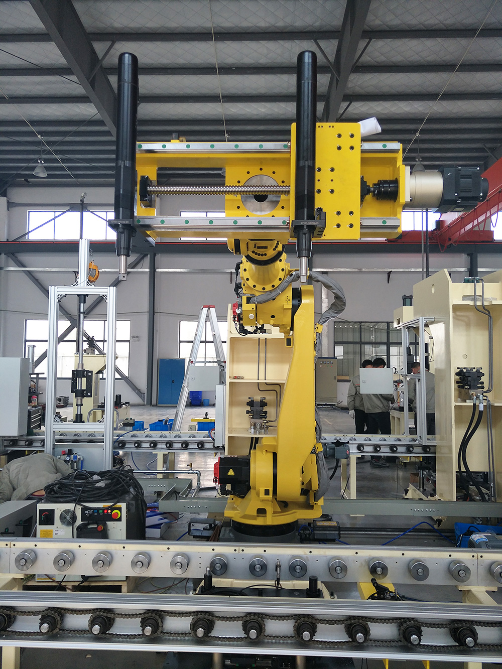 機器人自動上下料是指通過工業機器人實現工件在加工設備(如機床、注塑機等)與物料臺之間的自動化裝卸作業,是智能制造生產線的關鍵環節。該系統主要由工業機器人、視覺檢測系統、抓取夾具、物料輸送線及控制系統組成:機器人搭載專用夾具(如真空吸盤、機械爪)精準抓取工件,視覺系統對物料位置、姿態進行實時檢測與校正,確保上下料精度;控制系統協調機器人與加工設備的動作時序,實現全流程自動化。
